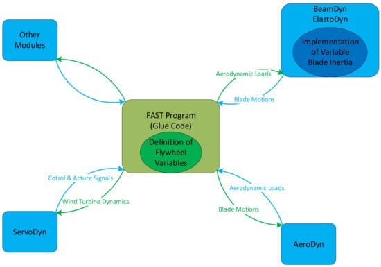 Since the goal of this paper is not to support a full geometric nonlinearity solution or to simulate a large deflection of an anisotropic composite material of a rotor blade with a pre-bended reference axis, it is obvious to choose ElastoDyn to implement the dynamic behavior of the FW system in OpenFAST. Although ElastoDyn uses a simpler mathematical theory than BeamDyn, the exact solutions of ElastoDyn meet the needs in this paper. A detailed comparison between ElastoDyn and BeamDyn is introduced in a previous project report of the author’s []. Figure 1 shows that the implementation of variable blade inertia takes place within the module of ElastoDyn, whereas the additional variables of the FW system are defined into the glue code of OpenFAST. This enables the FW variables to be passed through the local and external modules of OpenFAST, as discussed later in the next sections.