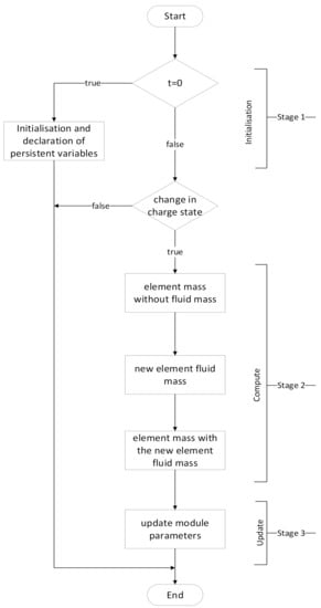 - Stage 2: This stage is responsible for the change in the masses of the blade elements regarding the charge-index-factor (K). At first, the masses of the blade elements are calculated without the additional fluid mass. Consequently, the new fluid mass of each blade element is calculated depending on the current value of K. Finally, the newly calculated fluid mass is added to the corresponded blade element mass. The entrance in this stage is conditional on the change in K, i.e., the K_t-1 from the previous simulation step must not be equal to the K_t from the current simulation step in order to enter this stage. Such a condition helps to speed up the simulation when no change in the charge state of the FW in any blade is happening.