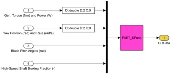 As Simulink is a popular simulation tool for the design and development of control algorithms, OpenFAST has also been implemented as a library that can be called from a Simulink S-Function block, using predefined inputs from Simulink. Therefore, modules such as Generator torque control, nacelle yaw control, pitch control, high-speed shaft brake, and other external modules can be designed in the Simulink environment and, meanwhile, they can use the complete nonlinear aeroelastic wind turbine equations of motion available in OpenFAST [].