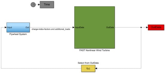 The wind turbine sample model, as shown in Figure 3, contains the S-Function block with the OpenFAST equations of motion. It also contains the control signals that are implanted in the above-mentioned control models. These models are deactivated in the Flywheel_System.mdl model in Figure 4, as the focus is only on the implementation of the FW system. Figure 4 shows the FW system block, which includes the equations of the additional loads and the charge-index-factors for each rotor blade. The next section will discuss in detail which loads are generated by the FW system and not considered in the OpenFAST equations of motion. The function block f(u) shown in Figure 4 is used to select certain data from OpenFAST outputs, which are required for the equations in the FW system model.