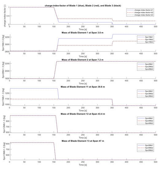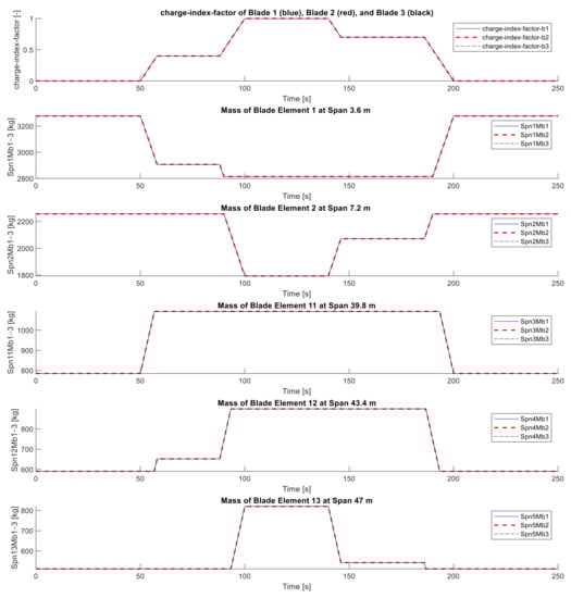 As mentioned in the introduction, blade spans, those that are close to the location of the blade root and tip accumulators of the FW type VI, are selected according to the Sandia 61.5 m rotor blade design. Therefore, blade elements 1 and 2 as well as blade elements 11, 12, and 13 are selected to represent the positions of the root and tip accumulators of the FW type VI, respectively. Figure 5 shows the span locations and the mass of these elements. The definition of the mechanical properties of the blade elements in the source code of ElastoDyn is based on the distributed sectional properties of the Sandia 61.5 m blade design. This design follows the characteristics of the NREL 5 MW reference turbine blade. The NREL 5 MW reference WT has three blades. The structural properties of each blade are distributed in sectional properties along the blade pitch-axis []. The distributed blade section mass is based on the geometry and the material selection for each blade section. Regarding the Sandia 61.5 m blade design, the dimensions of the blade root sections are much bigger than the geometry of the blade body and the blade tip sections. Therefore, most of the blade mass is concentrate near to the blade root. This difference in the mass distribution along the rotor blade can also be seen in the difference between the mass of the blade elements in Figure 5, where blade element 1 at a span location of 3.6 m is much heavier than blade element 13 at a span location of 47 m. Figure 5 also shows a fluid mass of 925.46 kg, which is corresponding to the total fluid mass of the FW type VI (see Table 1), which is shifted between the root and tip accumulator. The charge-index-factors determine when and where how much fluid mass must be shifted and which is baled. For the simulation scenario in Figure 5, the FW is charged and discharged simultaneously in the rotor, therefore, the charge-index-factors of the three blades are identical. Unsynchronized charging/discharging is discussed in the next section.