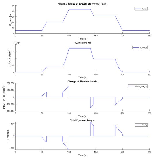 The resulting total FW torque from the three blades, , and its relation to the change in the FW inertia, are illustrated in Figure 6. Figure 6 also shows the change in the value of the variable center of gravity,