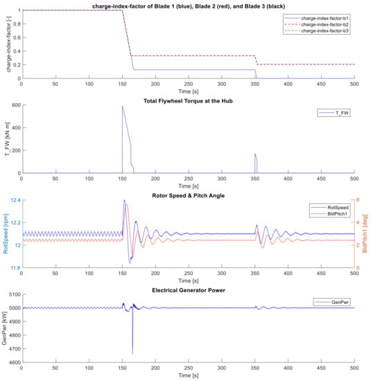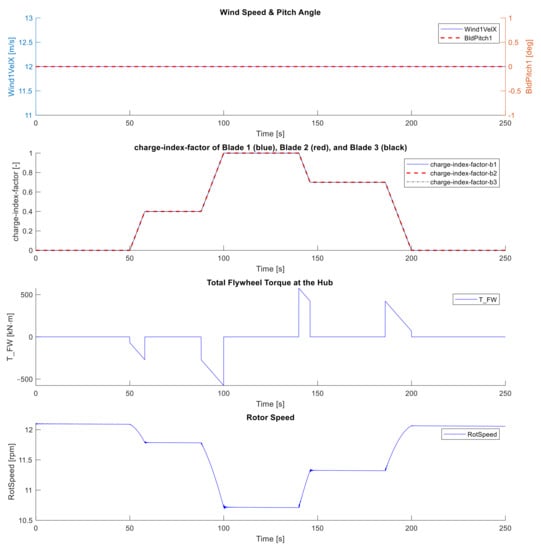 The impact of variable blade inertia on the rotor speed of the WT due to the application of the FW system is illustrated in Figure 7. Where it is obvious that the increase of the blade inertia by charging the FW system leads to slowing down the rotor speed on the one hand and, on the other hand, the decrease of the blade inertia by discharging the FW system leads to speed up the rotor speed. As mentioned above, since the control system and the aerodynamic loads of the WT are deactivated, the decrease of the rotor speed is not recovered by the aerodynamics or by pitching the rotor blades. This can be obviously seen in Figure 7 as the pitch angle is still unchanged during the whole simulation time, even when the rotor speed changes due to the change in the blade inertia.
