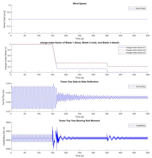 For the above simulation scenario of rotor imbalance, the WT runs under rated steady wind conditions with a constant horizontal wind speed of 12 m/s. The FW system is initially fully charged in the rotor and is discharged not simultaneously in the three blades, see Figure 9. Such initial rotor imbalance is a 1p excitation, which excites the tower to a later vibration. Figure 9 shows this vibration in terms of side-to-side deflection of the tower top, where the vibration amplitudes of the tower top side-to-side deflections are obviously much greater within the period of the rotor imbalance than the period after the imbalance correction at a simulation time of 167 s. The reason for this is essentially that there is a grater tower-top yaw bearing roll moment before rather than after the correction of rotor imbalance.