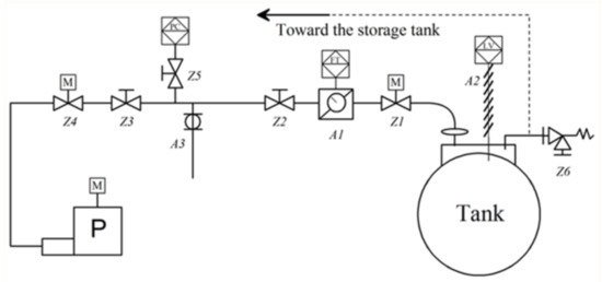 Each stand is equipped with a filling head and hoses that deliver sulphuric acid (VI) to the head. The head is mounted on the crane and connected with the pipeline installation that supplies the fillers. Each filler consists of the following components: a manual valve, inductive flow meter, and a gate valve with an electric actuator that is signal-controlled from the control room. The pipeline installation, from the delivery port of the vertical feed pump to the filling hoses, is made of acid-proof steel while the hoses themselves are made of composite material. The fillers are supplied by a vertical pump plunged in the pump tank. The acid is delivered via the pipeline to the collector located under the filling platform. The top point of the pipeline is fitted with a vent valve. The collector is connected with each filler via the distributing pipes. The collector is equipped with a draining valve and a control flashlight. The nominal acid flow rate for each filler is 30 m3/h. Its maximum operating pressure is approx. 2 × 105 Pa. Figure 1 presents the technological diagram of the installation for the filler used for the experiments. This section is representative for the whole installation due to the same design of the other fillers.