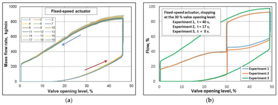 Figure 2a presents results of 19 experiments assessing the mass flow rate vs. the valve opening level that aimed at verifying result repeatability. These characteristics were obtained for the following measuring procedure: the valve transition from the 0% to approx. 45% opening level, stopping for approx. 40 s and closing to 0%, followed by stopping again for approx. 40 s. Unusual shapes of the characteristics recorded (wide hysteresis) were observed that markedly deviated from the standard and literature flow characteristics [9,10,11]. Figure 2b is a graphical illustration of the flow vs. the valve opening level for three experiments (using the fixed-speed actuator) where the value of actuator stopping time was changed at the 30% valve opening level. The values were 40 s, 17 s, and 0 s for the experiments 1, 2, and 3, respectively. Using a variable-speed actuator fitted with the function of speed change before the positioning point, the characteristics can be appropriately profiled and the valve position can be precisely set.