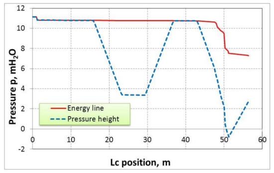 Figure 4 shows energy lines and pressure heights for the 49% control valve opening level according to the model characteristics of Figure 3. These characteristics result from the Bernoulli’s equation being the measure of mechanical energy (expressed in liquid column height units) for the fluid flow. They are included in the mathematical description of the flow system technological flows. The presented energy line was determined for real liquid, and pressure losses were taken into account in the model. These losses are of two types for real fluids: local loss (change in the geometrical shape of the tubing, e.g., valves, elbows, necking) and friction loss (liquid viscosity, flow type, and tubing smoothness). In the presented characteristics, the pressure height value reflects the ratio of static pressure to the product of fluid density multiplied by the gravitational acceleration. The pressure height line is shifted against the energy line by the factor called rate height w2/2 g.