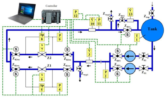 For the investigations regarding actuator characteristics, a control ball valve (CBV) was applied with a shaped hole of equal percentage control characteristics. Moreover, a fixed-speed 0–90° NRY24-SR actuator [13] for the valve automated control along with the manual control option was used. The stand diagram is presented in Figure 5, where the following parameters are highlighted: p—pressure, Δp—pressure drop, —volumetric fluid flow, T—temperature, and x—valve opening level. The stand was fitted with several measuring devices, including high-advanced measuring technique equipment (ultrasound, electromagnetic, and sensory), to ensure high measurement precision. In addition, the stand was equipped with the controller and the computer system to modify the experiments according to the own software developed in the industrial LabView environment.