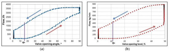 The experiments under the (O/Z) procedure resulted in the characteristics presented in Figure 6a,b, where it can be observed that: the opening course does not overlap the closing course; the closing course is improper because the ball valves demonstrate the dead angle, which means that no flow is detected below this angle [16]. The estimated dead angle for the CBV is φ0 = 16.7°; the CBV characteristics obtained in the laboratory tests (Figure 6a) confirmed the unusual shape of the characteristic resulting from the industrial experiments (Figure 6b). The characteristics presented in Figure 6 are very inconvenient for the fluid flow control processes. In this case, the control system faces significant problems with setting the appropriate value; moreover, so-called pumping is frequently observed in the system.