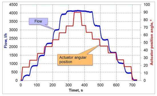 To assess effects of the actuator speed on the flow characteristics, a low transition speed actuator should be used or the speed should be reduced if this function is possible to be programmed. Unfortunately, the NRY24-SR is a fixed-speed actuator, so a control procedure was developed to lengthen the time of its full transition, involving short-time actuator stopping within the programmed angular positions. The procedure was specified as the (O/Z)Stop, and the results of flow meter and actuator dynamics tests are presented in Figure 7. The flow characteristic obtained according to the procedure is presented in Figure 8.