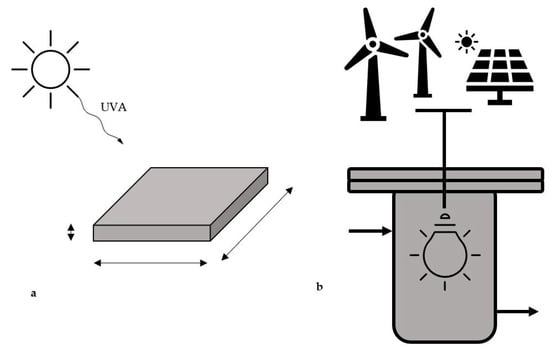 Furthermore, the theoretical productivity achieved with the direct exploitation of the sunlight is compared with the performance that would be reached if the photoreactor would employ electrical energy obtained from renewable sources. Indeed, the photoreactor may be differently designed (a) for direct irradiance by solar light or (b) for use with UVA lamps that may be feed with renewable electricity. In option (b) photovoltaic (PV) panels and wind turbines are explored as sources of electricity for the lamps that irradiate the photoreactor. A scheme of both the proposed setups is reported in Figure 1.
