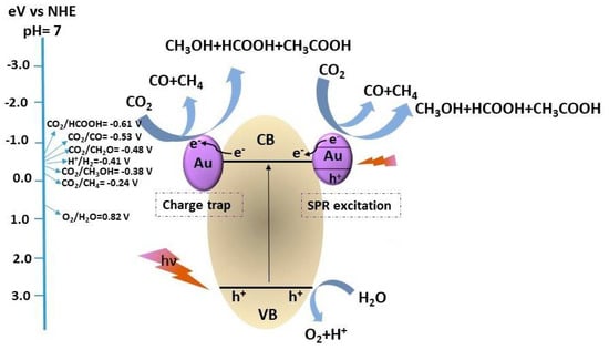 Despite many efforts to dispose of carbon dioxide in alternative ways, such as Carbon Capture and Sequestration (CCS), one of the most promising approaches to reduce the rate of CO2 emissions is to convert it into regenerated chemicals [7,8,9,10]. As a reagent, carbon dioxide is too stable to react spontaneously under mild conditions (i.e., low temperature and low pressure), but catalyzed reactions and electrochemical processes proved to be effective for the production of methanol, methane, formaldehyde, formic acid and carbon monoxide [11,12,13,14]. A further step towards the sustainability of that kind of treatment is the exploitation of a renewable energy source to support the energy demanding up-hill reactions from CO2 to regenerated fuels [15,16,17,18,19,20], among which the most fascinating is certainly solar radiation. In particular, electrochemical reduction may take advantage of existing photovoltaic plants, though their theoretical efficiency is capped at 30% in the case of silicon-based panels [21], further lowered by considering the efficiency of electrochemical CO2 conversion, while it is gaining more popularity in the concept of photocatalyzed processes [22,23,24,25,26,27,28]. In the latter case, a semiconductor is employed that harvests light of appropriate wavelength forms in a photoexcited electron-hole couple. The latter is used to promote redox reactions; in this case the photopromoted electron reduces CO2 to formic acid, formaldehyde, methanol or methane [29].