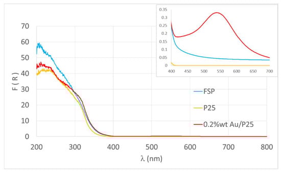 When the UV radiation hits the photocatalyst surface and is absorbed, it causes the excitation of one electron to the conduction band from the valence band, leaving a hole in the latter. However, only radiation of proper energy can be absorbed, depending on the band gap of the material, thus the narrower is this value and the longer is the maximum wavelength of the absorbed radiation, allowing to better exploit the solar spectrum. On the other hand, if the band gap is too narrow, the absolute energy of the valence and conduction bands may not be suitable to perform the redox reaction of interest [29]. Therefore, the wavelength threshold was calculated according to (Equation (1)), based on Diffuse Reflectance UV data (Table 2).