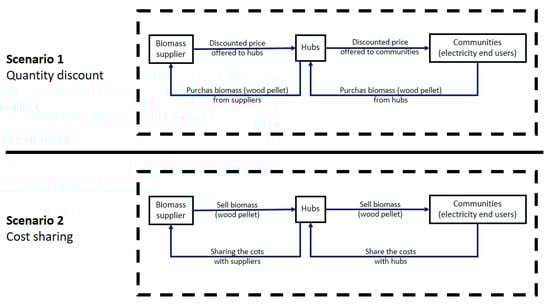 Establishing a large delivery quantity of biomass from suppliers to communities could promote the economies of scale in biomass supply chains [7]. A quantity discount strategy could encourage large quantities of biomass being delivered to hubs and subsequently to communities. In this sense, the suppliers and hubs will decide about optimal biomass prices across their corresponding supply chain channels according to demand from the communities. Moreover, the optimal quantities and schedule of the orders at the hub and communities have to be aligned, accordingly to these prices. Alternatively, the coordination could be promoted through a cost-sharing among players to increase the delivery quantities and improve the economies of scale. In this scenario, the selling entity earns an income out of large quantities of sales and compensates a portion of the purchasing and storage entity’s cost to stimulate large order quantities. Although the selling agent increases its cost in this situation, it could increase its revenue simultaneously. Based on this scenario, communities, and hubs, as well as hubs and suppliers, share costs to promote collective (larger) quantities through compensation of costs. In doing so, the ratio of cost to be shared with other parties across the supply chain will be a decision variable. Both coordination scenarios are depicted in Figure 2.