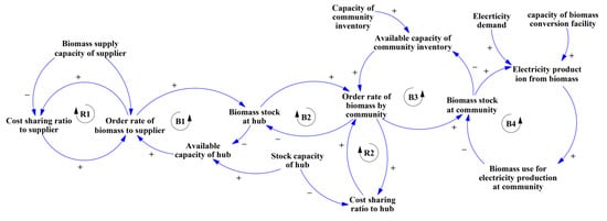 A causal loop diagram (CLD) is a representative tool for illustrating the feedback structures of a system. It is built upon presenting the relationships among the variables by causal links with arrows. If the relationship is balancing, with the related variables change in an opposite direction the arrow will be represented by a negative (−) sign while it they change in the same direction, the relationship is considered a reinforcing one represented by a positive (+) sign [39]. The causal relationship diagrams of coordination strategies in a biomass supply chain are presented as follows.