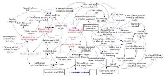 A simulation based-optimization model is constructed by developing a stock-flow diagram for each coordination scenarios with respect to the above discussed causal loop diagrams. The proposed SD models are implemented in the VENSIM Professional version 8.1.2 software (Ventana Systems, Inc., Harvard, MA, USA) [40]. The SD models are presented through stock-flow diagrams. A stock variable (represented by a box) could describe the state of the system at any time step. The double line arrows towards and outwards of the stocks describes the flow variables as inflows to and outflows from the stocks. In this sense, the net flow into a stock shows the rate of change in that stock. Constants (parameters) are the values not changing over time, and auxiliary variables are functions of stocks or constants in forms of objective functions, constraints, and formulated strategies [39]. The models corresponding to quantity discount and cost-sharing strategies are presented in Figure 5 and Figure 6, respectively. In these models, biomass stock levels at communities, cumulative energy conversion cost of communities, biomass stock levels at the hubs, cumulative cost of hubs, and the cumulative total cost of the biomass supply chain are considered as stock variables with their inflows and outflows as the flow variables. List of variables and parameters of the model with their descriptions, corresponding players, and units are presented in the Appendix A.