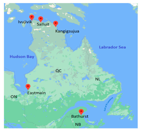 The case study contains three remote and off-grid communities in the north of Canada as electricity end-users, which are Kangigsujuaq (KA), Salluit (SA), and Ivujivik (IV) in the north of Quebec. Off-grid diesel facilities currently produce electricity. The biomass type is assumed as wood pellet, which can only be supplied to communities by waterways (Figure 7). The communities have small economies of scale because of their size and remoteness. The case study considers two hubs to supply wood pellet to communities and receiving biomass from six suppliers. The first hub is in Eastmain in the west of Quebec (QC), supplied by three suppliers in the provinces of QC, NB, and the state of Maine. The second hub is in Bathurst in the northeast of New Brunswick and could order biomass to three suppliers in QC (QC1, QC2, and QC3). Considering one month time step in the model, it is assumed that the hubs can receive the orders during the time between April (t = 3) and August (t = 7), and the delivery time to communities is from April (t = 3) until the end of September. The data used in this study are derived from [7] and provided in the Appendix A.