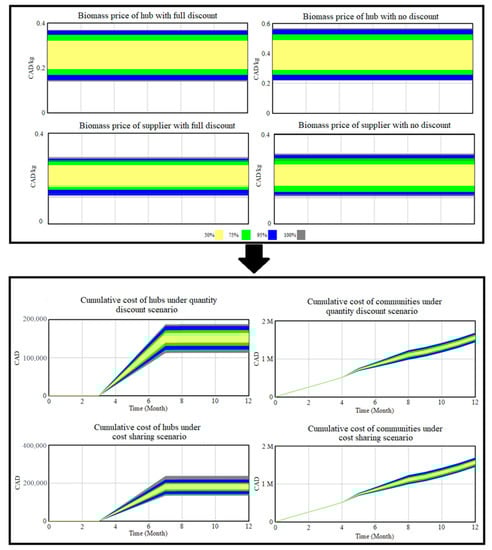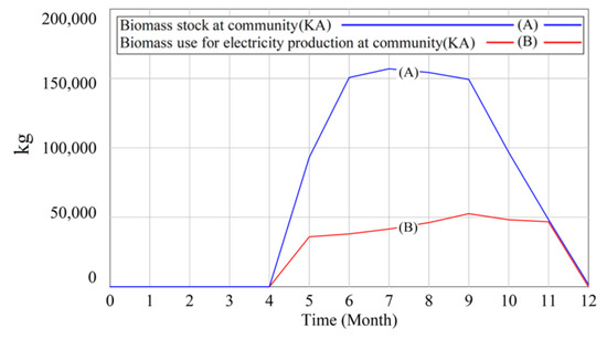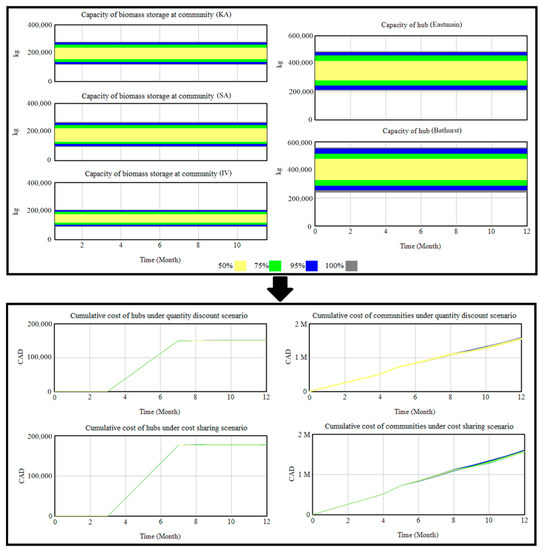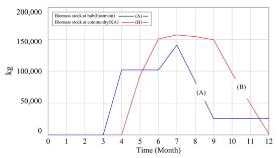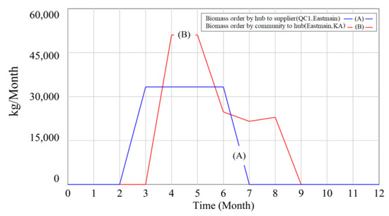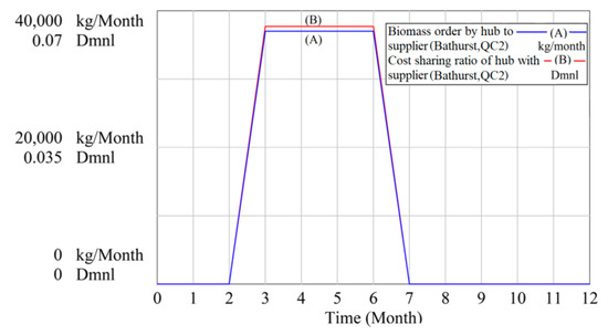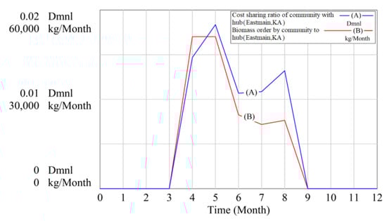 Vensim optimization platform employs a Powell hill-climbing algorithm [42] to search for the optimal schedule of the variables. We consider a time horizon of 12 months to reflect on the seasonality effects with respect to biomass supply and local climate. Minimizing the total collective cost of biomass supply chain subject to constraints presented by Equations (31)–(38) will result in search for optimal decisions on the delivery schedule of biomass, offered prices, and cost-sharing ratios leading to biomass and diesel conversion facilities’ operational plans as well as inventory levels at hubs and communities. The simulation based-optimization cycle will be conducted over the time horizon. Figure 8, Figure 9, Figure 10, Figure 11, Figure 12, Figure 13, Figure 14, Figure 15 and Figure 16 show the results of the sequential optimization and simulation processes for a representative supplier, hub, and community.