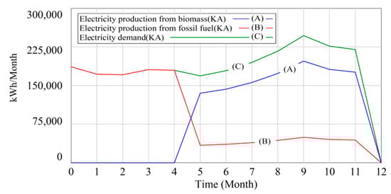 and : Electricity production from biomass at time “t”—(kWh/month), : Levelized biomass to electricity conversion cost—(CAD/kWh), : Biomass use for electricity production at community “j” at time “t”—(kg/month), : Biomass conversion ratio in community “j” (kWh/kg), and : Loading factor of biomass electricity generation facility at community “j”—().