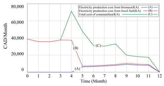 The cumulative cost of communities consists of biomass distribution cost to communities and their storage cost as well as cost of energy generation from biomass and fossil fuels calculated through Equations (16) and (17):