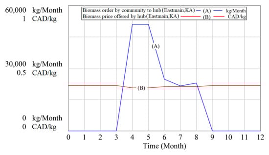 where : Biomass price offered by hub “k” to community “j” including delivery at time “t”—(CAD/kg) and : Biomass order by community “j” to hub “k” at time “t”—(kg/month).