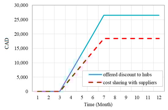where : Hubs’ cost shared with suppliers at time “t”—(CAD/month).