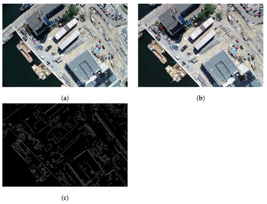 On the other hand, when it comes to detecting the edges in the photograph, the most common methods for this purpose are those that can be divided into two groups, based on either the first-order derivative (gradient) [36,37,38,39] or the second-order derivative (using the Laplace of the Gaussian function) [40,41]. Among them, the method proposed by John Canny [41] was found to be the most suitable for the detection of edges, which are to be fitted in the second place to the coastline generated based on the ENC. This method was chosen mainly due to its three main performance criteria, that is: