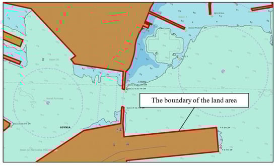 Each line or area object is encoded in ENC as a set of nodes using the “chain-node” topology [43]. The location of the node is most often described by ellipsoidal coordinates in the World Geodetic System 1984 (WGS 84) [44], although it should be borne in mind that the “S-57” standard defines 228 of them, each of which can be used [43]. Node pairs form edges that can be utilized, among other things, for the geometric description of the coastline. The “S-57” standard defines, in the “Object Catalog”, several hundred classes of objects, attributes and attribute domains [45]. The object classes and their attributes provided with the standard allow describing of most of the real world objects necessary to be placed on marine navigation charts. For the coding of the land area, the spatial object of the GEO type with the acronym LNDARE (code 71) is used, defined as the solid portion of the Earth’s surface, as opposed to sea or water (IHO Dictionary, S-32, 5th Edition, 2635) [45,46]. Figure 2 shows an image of an electronic navigational chart (display “all other information” [47,48]) with the border of the land area marked.