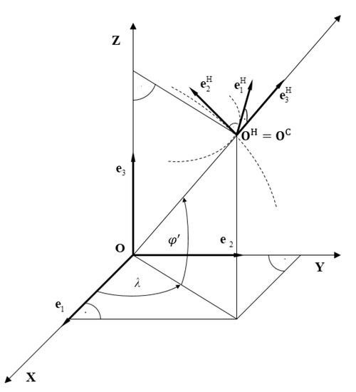 Assuming will correspond to the Earth-Centered Earth-Fixed (ECEF) coordinate system [49,50,51], will correspond to the East-North-Up (ENU) coordinate system (Figure 3).