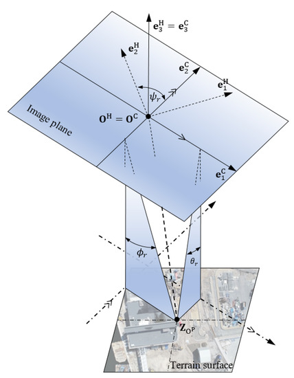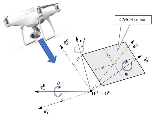 Frame of reference will be rigidly related to the projection system (i.e., the projection center and the CMOS projection) of the camera on the UAV in such a way that the direction of the versor will be consistent with the direction of the camera’s optical axis. The other two versors, , will lie in a plane parallel to the plane of the camera’s COMS matrix passing through the focal point (projection centre) . The versor after mapping to the CMOS matrix will lie in the middle of its height, and the versor halfway across its width (Figure 4). Rotation of the base of the reference system will be performed in relation to the base of the reference system according to the dependencies (Figure 4):