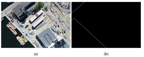 Figure 5 shows the coastline’s image obtained as a result of the perspective projection of the edge of the land area from the ENC No. PL5GDYNA.000 corresponding to the DJI FC6310R camera, wherein it was assumed that (54321.116 N, 183248.528 E, 131.44 m),yaw ( 128.0, pitch , 0, 5472 pixels, 3648 pixels, 12.8333 mm, 8.55554 mm, and 8.5797 mm—these values were read out from the eXtensible Metadata Platform (XMP) tags [55] of the .jpg file of the photograph presented in Figure 1 and the database of camera model parameters in Mapper Pix4D [56].
