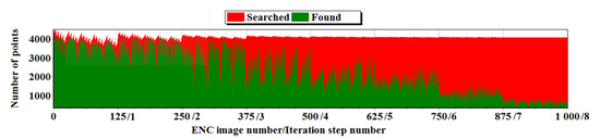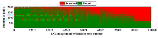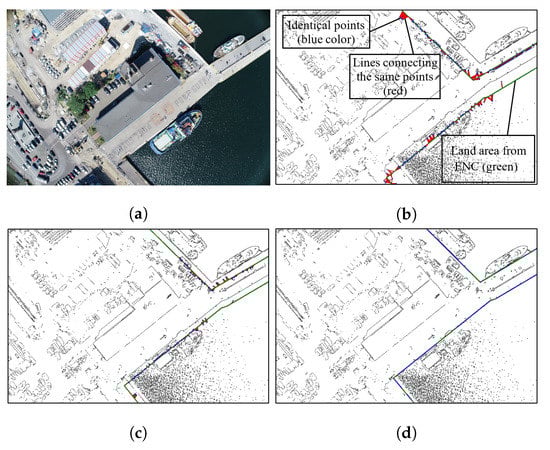 For determining spatial orientation angle corrections (, , ), an iterative method of matching the boundary of the land area obtained on the basis of the ENC (e.g., Figure 5) to the edges detected in the photo (e.g., Figure 1c) was used, with the evaluation of the sum of squares of the distance “deviations” between the identical points or the border of the area of the close neighborhood (20). At each iteration step i, for each point in the set —representing the boundary of the land area with the ENC, a point “identical” to the set is assigned, representing the edge points detected in the photograph. The association of the points from set with points from set is based on the nearest neighbor algorithm (NN) [57]. The area in the vicinity of the point from set specifies a circle with radius length (changed in each step of the main iteration i), determined according to the dependencies: