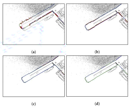 The analysis of the photos presented in Figure 10 and Figure 11 shows that the course of the process of adjusting the boundary of the land area generated based on the ENC in subsequent iterations is similar. A significant match can be seen as early as the third iteration. The visible disturbances in the photographs caused by the reflection of sunlight from the water surface (visible in particular in photograph No. 1) and the hulls and mooring lines of the ships standing at the pier do not affect the selection’s accuracy of the appropriate edges.