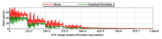 In turn, the graphs presented in Figure 10 and Figure 11 show that the mean value as well as the standard deviation of the distance between identical points from sets and decrease in successive iterations oscillating abruptly within the circle of radius (near neighborhood area). Their stabilization (reducing the amplitude of fluctuations) is much faster in the case of photograph No. 1 than photograph No. 5. This allows us to hypothesize that the achievement of stabilization in later iterations may indicate that the determined corrections of the spatial orientation angles () will be burdened with a gross error.