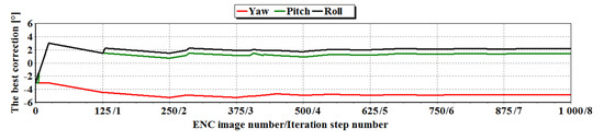 The presented analysis of the iterative process of determining the corrections of the spatial orientation angles has confirmed the correctness of the methodology proposed in the article. The only identified main drawback was related to the situation where the land area’s border has a shape similar to a straight line, and its use should be avoided then. Therefore, the decision to use the methodology should be preceded by an analysis of the shape of the coastline generated based on the ENC in terms of the presence of refractions. The decision-making process could then take place, for example, based on the internal energy of the active “snake” contour model [68,69] or the sum of the distance from the line section determined following the Ramer-Douglas-Peucker algorithm [70,71]. Additionally, a requirement for a minimum number of identical points selected from the set may also be considered (e.g., calculated by the method of interval estimation for the assumed confidence level), allowing the determination of the corrections with the error within the specified limits.