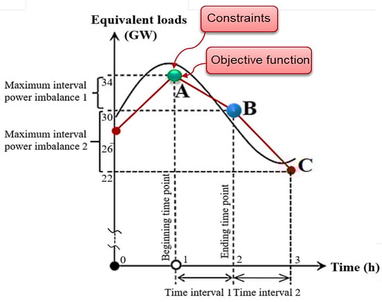 During both day-ahead and real-time scheduling, the OPF problem is solved sequentially for future discrete points in time, resulting in a stepwise optimal generation schedule that periodically adjusts the controllable power outputs [12,15,16]. This use of a discrete time OPF for the continuous problem is visualized in Figure 1, wherein traditional optimal power flow ensures is optimal at discrete points in time (typically the initial point of a time interval, for example point A), and assumes that the solution will satisfy the operational constraints until the subsequent solution point, for example point B, which is the initial point for the next time interval 2.
