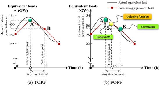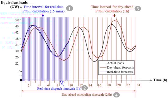 Compared with real-time dispatch, the timescale for day-ahead scheduling (24 h) and its LI (1 h) are longer, resulting in larger forecast error and a more approximate result. Since the timescale for real time dispatch and its LI are smaller, the forecast accuracy is expected to be significantly improved. Real-time POPF uses this more accurate information to update and correct the more approximate day-ahead POPF to better represent conditions and help system’s power balancing process.