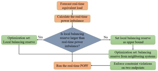 The first step while making real-time generation schedules is to forecast the net loads, after which the real time power imbalance is identified. If local balancing reserve has the capability to fully balance the real-time power imbalance, then real-time POPF is calculated within the local balancing reserve capacity. Otherwise, the balancing reserve is first set as upper bound value before running the real-time POPF.