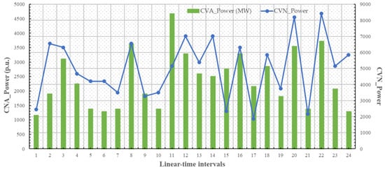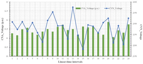 All the operational constraints for the 24 LIs are satisfied in the day-ahead POPF. The TOPF, on the contrary, produces over-limits for branch power and voltage magnitude violations, as shown in Figure 8 and Figure 9. wherein the “CVN” and “CVA” represent constraint violation numbers and constraint violation amounts. Therefore, unlike the day-ahead POPF, the TOPF results in both thermal and voltage constraint violations in all the 24 LIs.