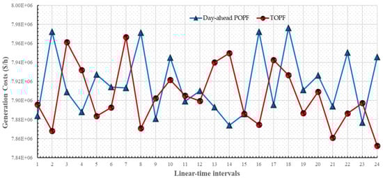 Generation costs between two models are compared in Figure 10, where generation costs of day-ahead POPF are still close to but generally larger than TOPF. Likewise, generation costs of day-ahead POPF is smaller than TOPF on certain LIs, such as the 4 th LI, since the TOPF optimizes on the initial time point while the total loads monotonically decrease over the interval, thus resulting in over-generation. However, in other cases, equivalent loads have different trends, either upward or downward, leading to constraint violations when decisions are made on the initial time point only.