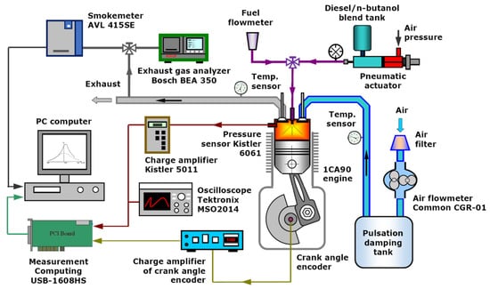 The test stand was equipped with a data recording and acquisition system to measure combustion pressure in the engine cylinder. The system consists of a pressure sensor located inside the cylinder, an encoder for crank angle (CA) marker, a charge amplifier, a data acquisition card with an A/D converter and a PC. On the stand, it was possible to measure engine exhaust emissions thanks to using a five-gas exhaust gas analyzer and a smokemeter. The equipment used made it possible to measure both the fuel consumption and the air supplied to the engine. The diagram of the experimental stand is shown in Figure 1, and details of the apparatus used are in Table 2.