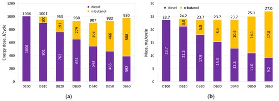 Figure 2. Effect of adding n-butanol to diesel on the energy dose (a) and the mass (b) of fuel delivered in each engine cycle.