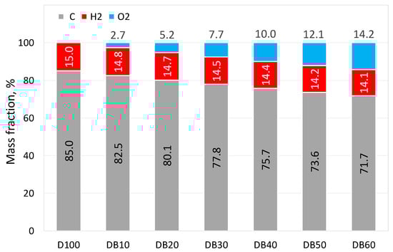 Butyl alcohol is an example of an oxygenated fuel in which 21.6% by weight is oxygen. 64.8% by weight is carbon, and the rest, 13.6%, is hydrogen. Figure 3 shows the changes in the percentages of these three elements in diesel fuel mixtures with n-butanol. It can be seen that with the increase in the percentage of n-butanol in the mixture, the oxygen content increases, reaching the highest value of 14.2% for DB60. For this mixture, the mass fraction of carbon was 71.1%. The increase in the proportion of oxygen and the decrease in the proportion of carbon in the mixture affect combustion and engine exhaust emissions.