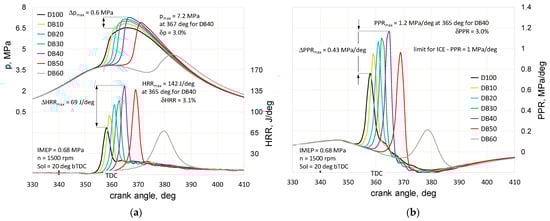 The heat release analysis is the basic source of information about the combustion process in a reciprocating engine. High values of the heat release rate give information about the rapid course of combustion. The integrated area under the HRR curve gives the course of heat release, making it possible to determine the characteristic stages of combustion. The obtained results show that up to 50% of n-butanol, the HRRmax value was higher than for the engine powered by D100. For the supply with DB40 mixture, there was increased HRR by 69 J/deg, almost double the value obtained for the supply of D100. The fast course of the combustion process is, on one hand, advantageous because the heat losses to the cylinder walls are reduced, but on the other hand, it leads to high-pressure increases, unfavorable for the engine crank mechanism. A very important parameter for an internal combustion engine, and above all for a compression ignition engine, is peak pressure rise (PPR). The maximum PRR value limits the engine operating load range and the applicability of various LTC combustion concepts. This parameter directly reflects the intensity of combustion. High PRR can cause harmful consequences, such as deterioration of engine performance and high engine noise [27]. A very high rate of heat release leads to an excessively high rate of pressure increase, limiting the operating range of the engine, especially in the case of high loads. The combustion of fuel–alcohol mixtures may increase PRR, caused mainly by the combustion of premixed combustion [6]. According to the literature, the acceptable level of PPRmax is 1 MPa/deg [39]. Figure 4b shows the changes in the PPR as a function of the crank angle. As in pressure and HRR, PPRmax also increases to DB40, reaching 1.2 MPa/deg. The acceptable PPRmax value was exceeded for DB20, DB30 and DB40. The high PPRmax problem can be solved using a split injection system. However, in this study, the fuel injection system did not allow for splitting the injected fuel dose.