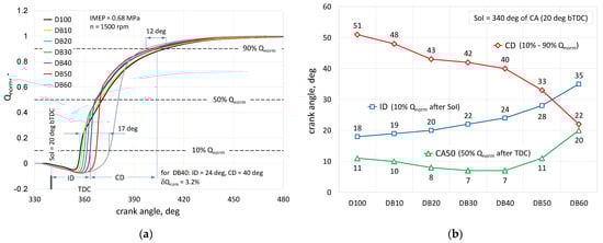 Figure 5. Normalized heat release (a) and combustion phases (b) for co-combustion of diesel with n-butanol.