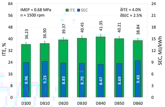 Figure 6 also shows the changes in the specific energy consumption (SEC) of an engine powered by diesel–n-butanol mixtures. SEC is expressed in MJ/kWh. The engine had the lowest SEC (8.47 MJ/kWh) for the DB40. As expected, the lowest SEC was obtained for the mixture with the highest thermal efficiency.
