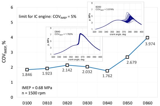 Based on the available literature, the maximum acceptable value of the coefficient of variation is determined. It is assumed that the internal combustion engine works stably when the COVIMEP value does not exceed 5% [39]. Figure 7 shows the COVIMEP changes for the engine powered by mixtures of diesel fuel with n-butanol, determined for 200 consecutive cycles of the engine operation. It can be seen that in the whole range of alcohol content, the dual-fuel engine worked stably, and COVIMEP both for diesel oil and mixtures of diesel fuel with n-butanol did not exceed the permissible value of 5%. Up to 40% share of n-butanol in the fuel mixture, no significant influence on the combustion stability was noted (COVIMEP ≅ 2%). Exceeding the 40% share of n-butanol in the mixture resulted in increased uniqueness of IMEP related, inter alia, with a significant delay in combustion in relation to TDC. The operation of the DB40 powered engine was the least unique, and it was similar to the uniqueness of the D100. The most stable engine operation for DM40 resulted in maximum thermal efficiency (Figure 6).