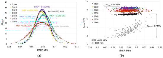 Figure 8. Probability density of indicated mean effective pressure (a) and pmax vs. IMEP (b) for test engine powered by diesel–n-butanol blends.