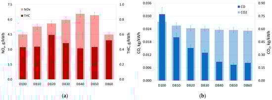 Figure 9. Specific emission of NOx and THC (a) and CO and CO2 (b) for test engine powered by diesel–n-butanol blends.