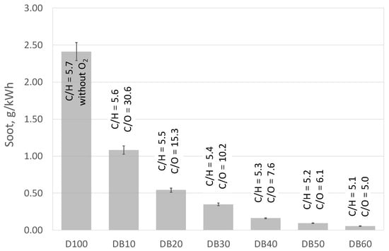 Soot is a major component of emitted particulate matter (PM) and is formed in the engine under high-temperature conditions and fuel-rich regions. These conditions are typical for the combustion of diesel fuel in a compression-ignition engine. Soot particles are formed very early in the process of diffusion combustion due to fuel dissociation under high-temperature conditions and a low excess air ratio (λ). Usually, under the operating conditions of a diesel engine, most of the soot formed in the first stage of the combustion process is removed in subsequent stages of the cycle due to oxygen-rich zones [35]. The most important parameters determining the sooting process are the local air/fuel ratio (C:H and C:O ratio), temperature, pressure and time needed to oxidize the fuel. Figure 10 shows the soot emissions for an engine powered by mixtures of diesel fuel and n-butanol. It can be seen that increasing the alcohol content from 0 to 60% causes a significant reduction in soot emissions. For the DB60, compared to the D100, the emission reduction was over 43 times. In general, hydrocarbon fuels have a strong tendency to form carbonaceous particles, i.e., soot. However, alcoholic fuels, such as n-butanol, contain much less carbon, and for them, the C:H ratio is much more favorable. This makes them not a good fuel for soot formation. Moreover, n-butanol contains oxygen (favorable C/O), contributing to the oxidation of soot and reducing its emission [29]. Figure 10 shows the values of the C:H and C:O ratios determined for the tested diesel–n-butanol mixtures. Another reason to reduce soot emissions is the properties of n-butanol, such as high latent heat of vaporization and high temperature of self-ignition, which, by delaying the ignition, contribute to better mixing of fuel with air and creating more favorable conditions for complete combustion of the fuel in the engine cylinder [35]. It should also be noted that diesel fuel contains mainly aromatic hydrocarbons, which are perceived as having the highest soot tendency [6].